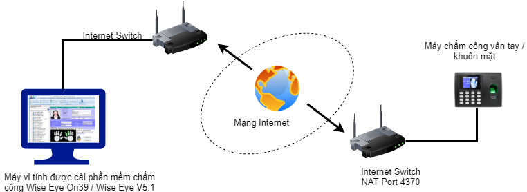 Phần mở rộng có mô hình bên trên. Máy công ở một nơi khác địa điểm cài phần mềm mà cần đưa dữ liệu chấm công về phần mềm. Tại nơi lắp máy chấm công chúng ta cần mở cổng (port) kết nối máy chấm công ( mặc định là 4370) ra ngoài Internet. Khi đó phần mềm sẽ khai báo IP WAN của router tại nơi lắp máy chấm công. Trường hợp IP WAN là một IP động thì chúng ta cần một tên miền để thay thế, hiện nay Dyn và NoIP là dịch phổ biến được tích hợp hầu hết các router trên thị trường. Nhìn lại thì ta thấy ở giải pháp này nếu có nhiều máy chấm công ở nhiều nơi khác nhau thì tốn rất nhiều công sức để quản lý việc mở cổng kết nối cho từng điểm và có thể tốn nhiều chi phí cho việc thuê tên miền. Khắc phục điều này mời quý vị xem chi tiết ở Giải Pháp 2
